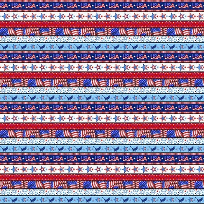 "Stars & Stripes Forever" designed by Sharla Fults for Studio E is a patriotic themed collection that features a DIY 24" x 44" banner panel, a small set star, tossed stars, USA Stars & Eagles, a fireworks design, a diagonal plaid and a versatile border stripe. The main colors used in this collection are red, white and blue.