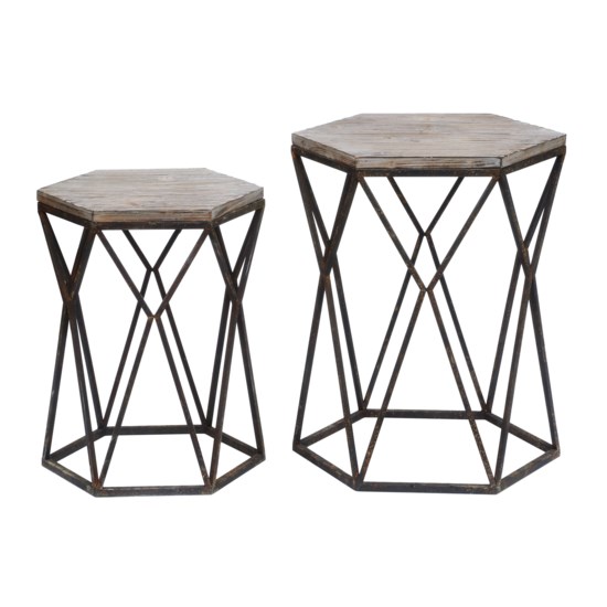 Beautiful, hexagon-shaped table made of wood and metal. Any use for this table, from a sofa end-table, to a bedside stand, or the perfect welcoming gesture for a small entryway. *Price for Larger table only*
