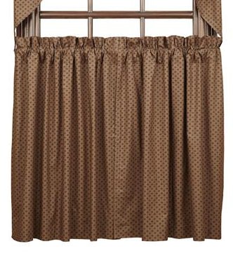 The tiers are 100% cotton, tan, star ditzy printed fabric, lined with white cotton and sold in a set of two. Each tier measures 36" length x 36" width. The header measures 2" and is included in overall measurements with a 3.25" rod pocket.