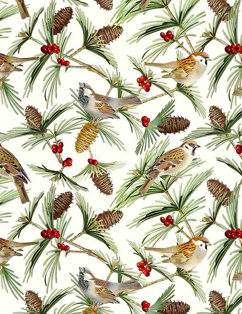 Timeless Treasures - Holiday Retreat - Birds & Pinecones, Cream