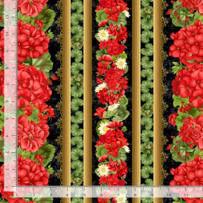 Introducing Scarlet Beauty by Timeless Treasures Fabrics, a mesmerizing quilting fabric collection that weaves together the elegance of nature and timeless artistry. This fabric is digitally printed, giving it brighter, more vibrant colors than traditional screen-printed fabrics. Create a space of beauty and elegance with this black fabric featuring large clusters of red geraniums with gold lettering, fluttering dragonflies, and ornate scrollwork.