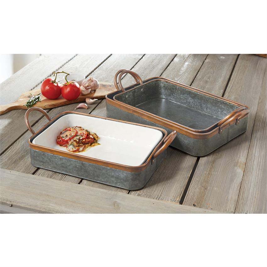 Galvanized tin casserole dish holder feature copper finish rim and coordinating dimensional handles. May be used as decorative accent to any glass or ceramic bakeware.