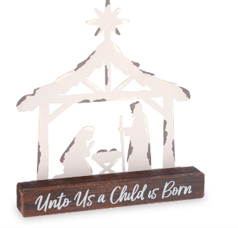 Holy family under a creche décor. The Holy Family is distressed white tin attached to a wooden block base. The base has the message "Unto us a child is born".