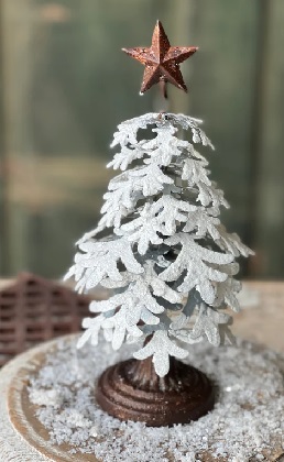 These trees display white branches, that look like they got flocked with snow right after a big blizzard. With a rustic base and a star on top, this is the perfect addition to a Country Christmas.
