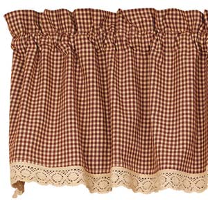 The Burgundy Granny's Check collection is made from burgundy and cream check fabric, with a crocheted looking lace edge and are 100% cotton. Valance has standard rod pockets.