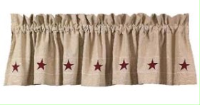This lined valance is made from a wonderful taupe-colored fabric with burgundy stars appliqued in a row. It's 100% cotton and has a standard rod pocket.