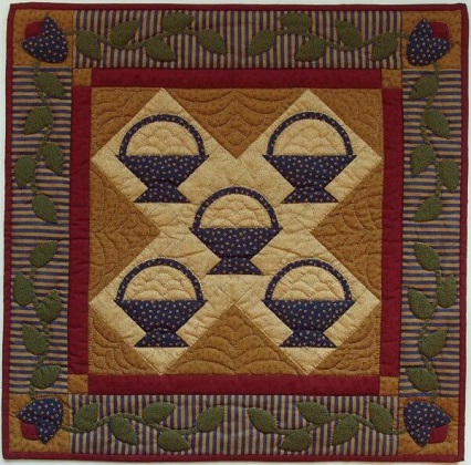 Inspired by the colors and patterns of heirloom quilts, this charming little piece will warm your heart and soul. Tiny baskets filled with piles of quilted feathers are the focus. A meandering vine graces the striped border. Finished size is 22? x 22.” Colors are dark red, blue, green, mustard and tan.