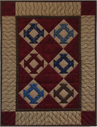 A little wall quilt full of old world allure! Traditional Hole in the Barn Door blocks, in varied colors, are set in a neutral background, surrounded by a brown border. The patchwork, anchored in dark red plain blocks, results in a wonderfully cozy look that will fit most any room decor. Finished size is 17? x 22?. Colors are red, brown, and blue.