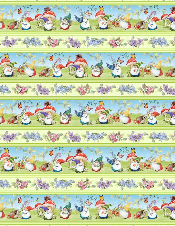Susan Winget designed this new collection called Gnome-Grown. It features a craft panel, repeating stripe and motifs of playful gnomes all in shade of yellow, blue and green.