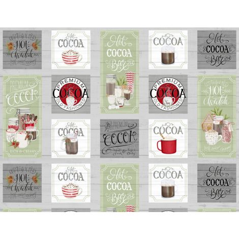 Hot Cocoa Bar collection is designed by Danielle Leone. It is a mixture of beautiful grays, charcoal, slightly dusty greens, & white with a bit of red. Dress up your kitchen with new curtains, tablecloth, tea towels and you can even sew together a pre-printed apron to match!