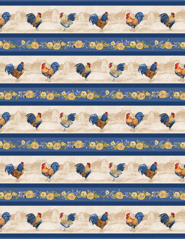 This new collection from Susan Winget called Morning Serenade is perfect for kitchen and tabletop projects. The collection includes placemats, a repeating stripe, and roosters posing on scenic backgrounds, along with scenic and floral toiles, tossed roosters, and chicken wire.