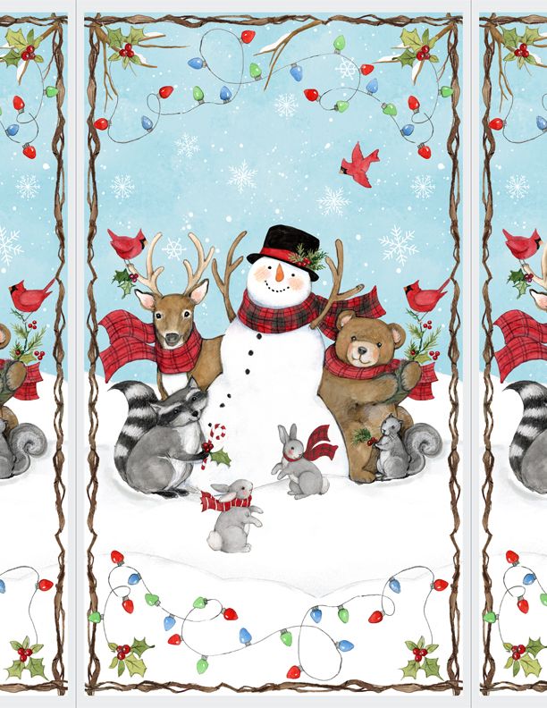 Susan Winget’s "Nose to Nose" collection features snowmen & friendly woodland animals interacting on a panel, a stripe, & a scenic (or maybe the deer are just after those carrot noses).