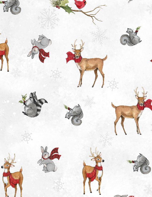 Susan Winget’s "Nose to Nose" collection features snowmen & friendly woodland animals interacting on a panel, a stripe, & a scenic (or maybe the deer are just after those carrot noses).