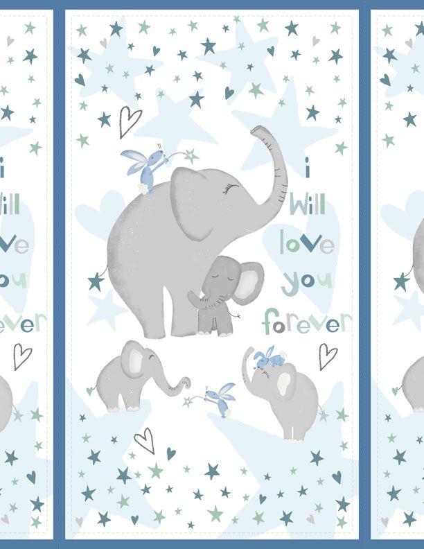 The Safari Lullaby collection features a large panel and repeating stripe with baby elephants and bunnies. The collection includes tosses of elephants, bunnies, hearts and stars, all in soft colors of blue, gray, white and teal.