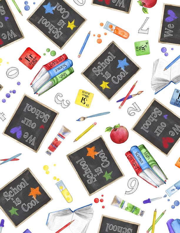 "School is Cool" is a great new collection from Nancy Mink featuring all the colorful tools for school in fun primary colors that are tossed on grounds of black and white, absolutely kid-friendly.