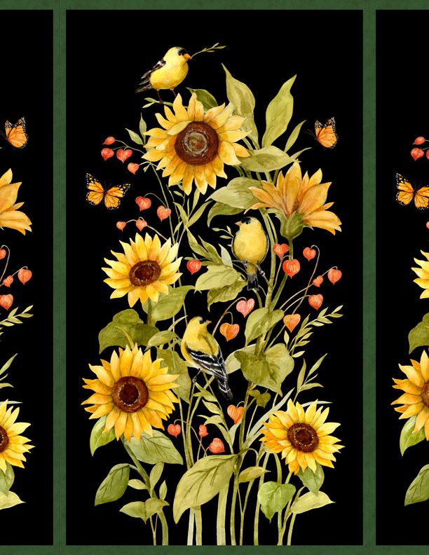 This Sunflower Splendor collection by Susan Winget features sunflowers, butterflies, birds, leaf and floral motifs. Included in the collection is a large panel and repeating stripe as well as plaids and tonal flowers in cream, yellow, green and black.