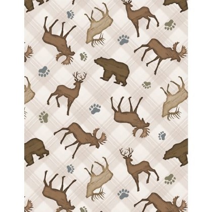 From Jennifer Pugh, we have Wildlife Trail featuring moose, elk, deer, and bears – all in silhouette. The colors include dusty blue, dusty green, and ivory/beige with motifs in shades of brown. Included in the collection are a panel of 11” pillow/block squares and a repeating stripe.