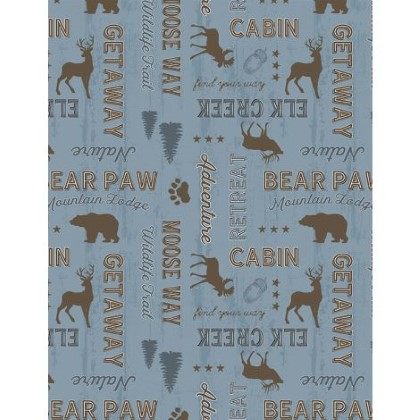 From Jennifer Pugh, we have Wildlife Trail featuring moose, elk, deer, and bears – all in silhouette. The colors include dusty blue, dusty green, and ivory/beige with motifs in shades of brown. Included in the collection are a panel of 11” pillow/block squares and a repeating stripe.