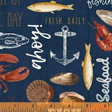 Rich red, navy, cream and gold make this fabric the 'Catch of the Day'! Great nautical motifs; lobsters, clams, etc. Perfect for table runners and place mats. Make a fun pair of shorts or shirt for cool summer wear! Designed by Whistler Studios.