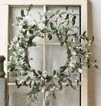 A beautiful pairing of rounded, cool-toned leaves and sprigs of white berries. Dusted with ultra-fine snow, glitter and mica..