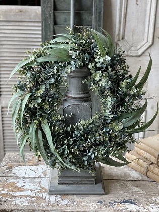 A stunning collection of eucalyptus accented with long, tapering leaves and branching elements.